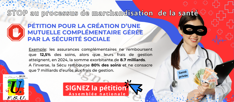 La FSU vous propose de signer la pétition « Pour la création d’une Mutuelle complémentaire gérée par la Sécurité Sociale » en ligne sur le site de l’Assemblée nationale (https://petitions.assemblee-nationale.fr/initiatives/i-5254#)